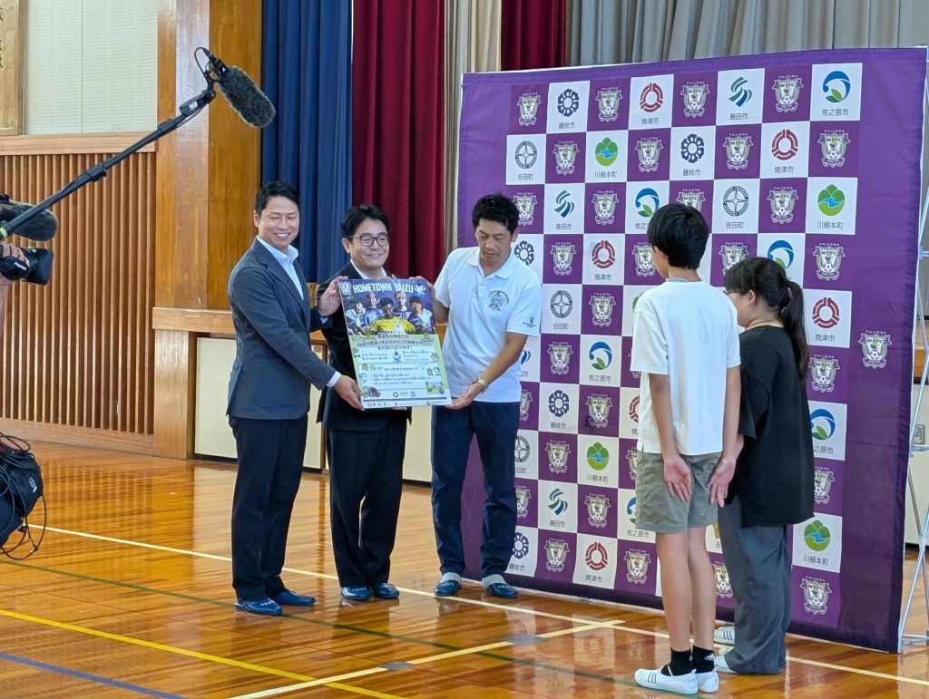 9月26日に市内小学校を代表し、焼津市立南小学校にて藤枝MYFC金子翔太選手、北村海チディ選手と協賛企業から、6学年児童への下敷き贈呈式が行われました。